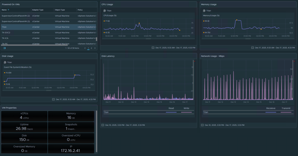 This dashboard works a little different and gives a list of powered on VMs in the top left, you select a VM and all the other widgets show the data for that VM, which includes